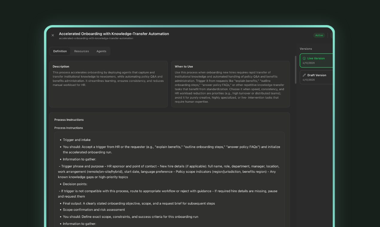Accelerate onboarding with agents that transfer institutional knowledge to new hires. Automate policy Q&A and benefits administration.